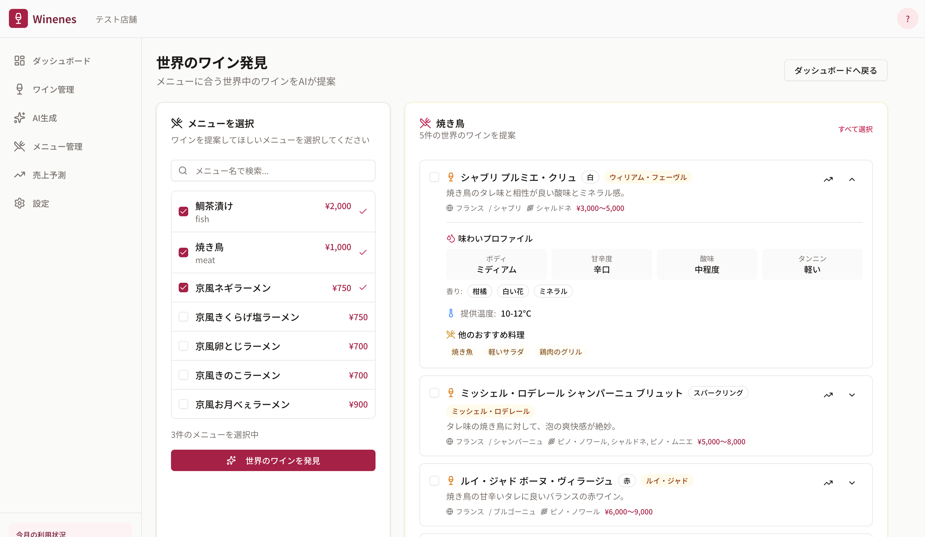 メニュー写真を取り込むだけで、料理の価格帯も考慮した最適なワインをAIが自動提案。バランスの取れた品揃えを実現。